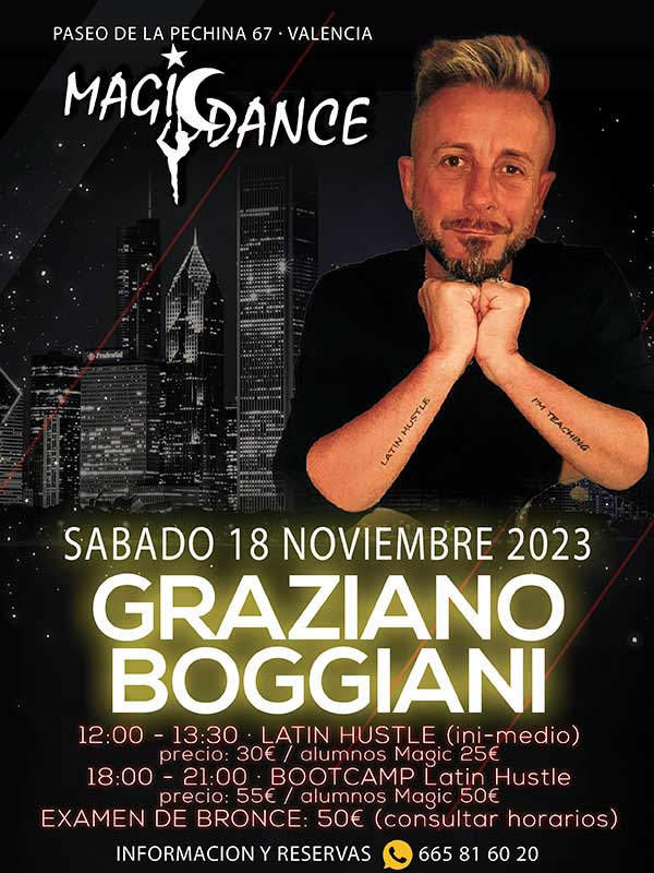 El próximo sábado 18 de noviembre tendremos la oportunidad de disfrutar de uno de los referentes del Latin Hustle en Europa. El maestro Graziano Boggiani impartirá talleres, realizará un bootcamp y realizará los exámenes para poder obtener la titulación Bronce de Latin Hustle. A continuación os ofrecemos el programa de actividades y los precios.